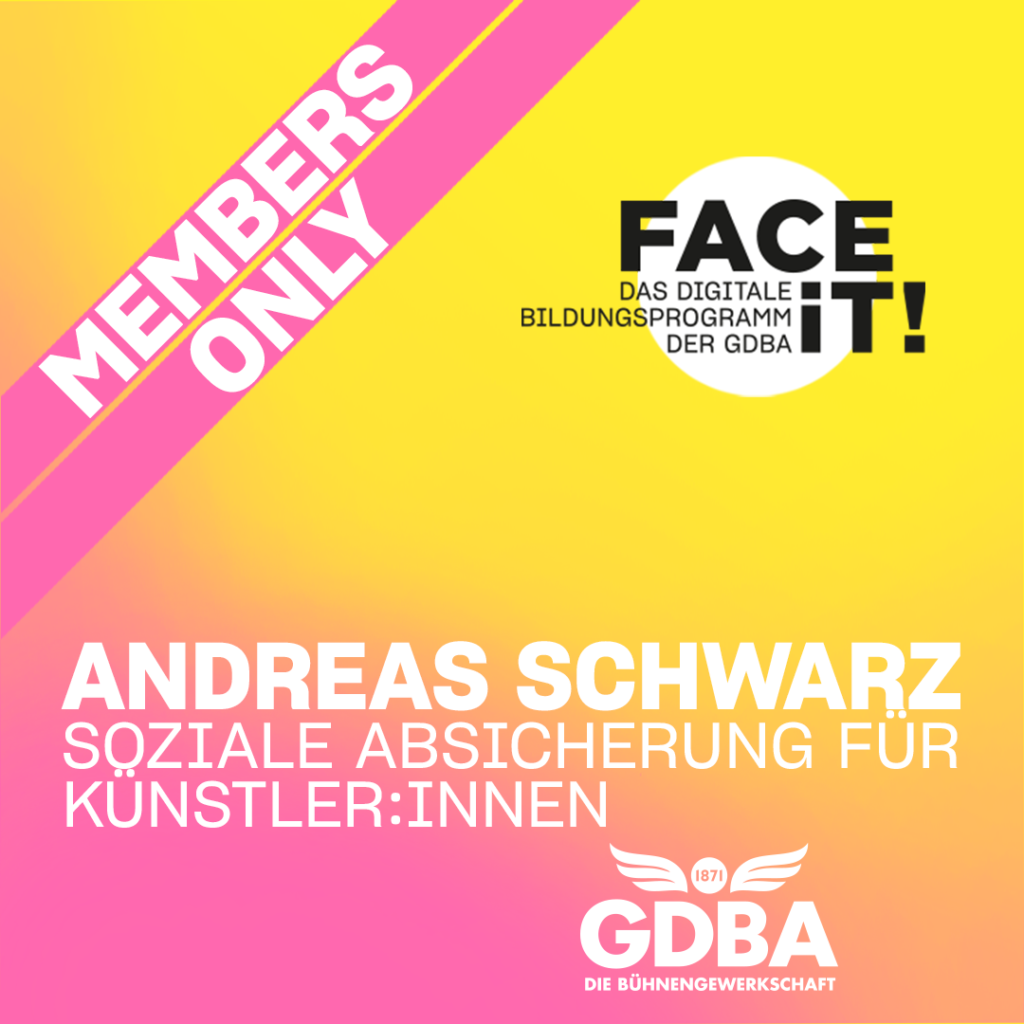 Aber wie geht das eigentlich? Was musst du alles beachten, wenn du den Schritt in die Selbstständigkeit wagst? Wie kommst du überhaupt an Aufträge? Kannst du es dir leisten, deinen festen Job zu kündigen, auch wenn du noch nicht „fully booked“ bist? Und: wie war das nochmal mit der KSK (und was ist das überhaupt…)? Diesen und vielen anderen Fragen widmet sich das FACE IT! Zum Thema. „Start in die Selbstständigkeit für Regie, Bühne, Kostüm“